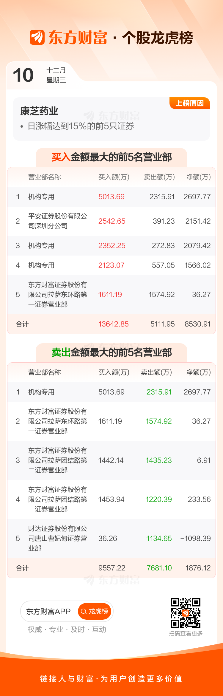 交易所2025年12月10日公布的交易公开信息显示,康芝药业因成为日涨幅达到15%的前5只证券上榜。康芝药业当日收报12.47元,涨跌幅15.46%,偏离值15.46%,换手率30.31%,成交额15.71亿。