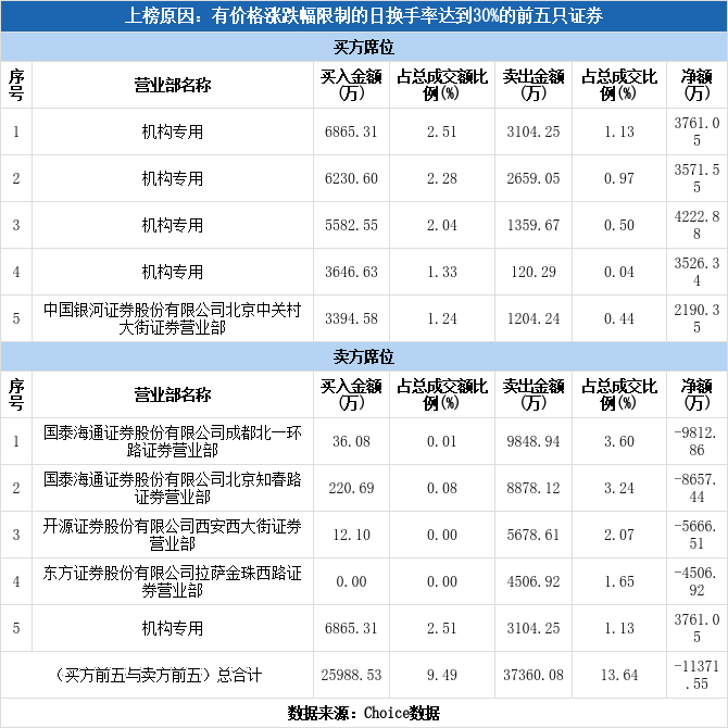 龙虎榜数据显示,今日共5个机构席位出现在龙虎榜单上,分别位列买一、买二、买三、买四、卖五,合计净买入1.51亿元,占该股今日总成交额的5.51%。除此之外还有神农种业、多氟多、海南海药等47只个股榜单上出现了机构的身影,其中23家呈现机构净买入,获净买入最多的是神农种业,净买额为4.85亿元;24家呈现机构净卖出,其中遭净卖出最高的为美埃科技,净卖额为1.37亿元。