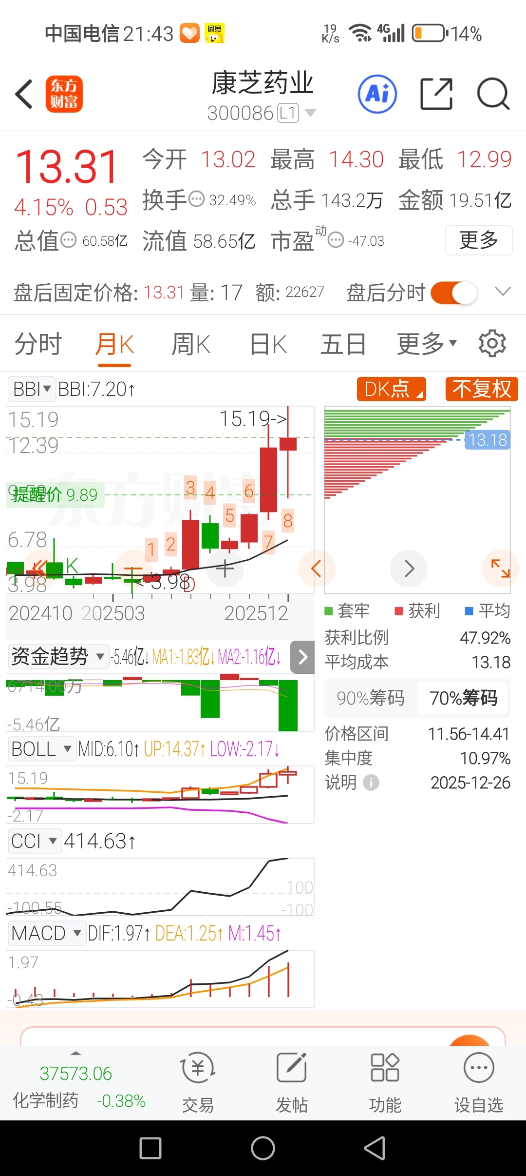 $康芝药业(SZ300086)$ 本周上涨20.78%