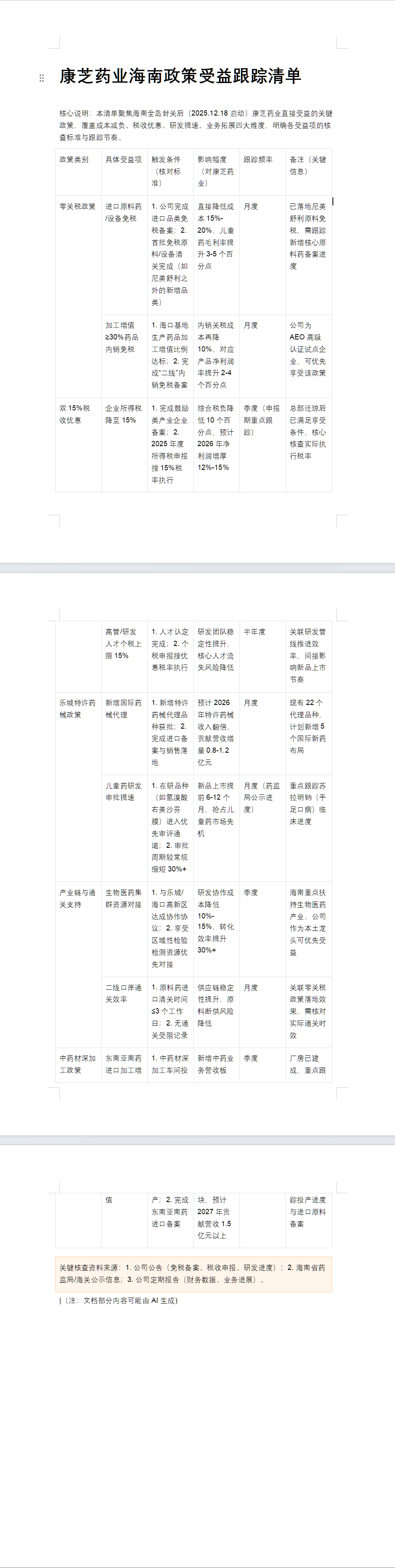 康芝药业海南政策受益跟踪清单