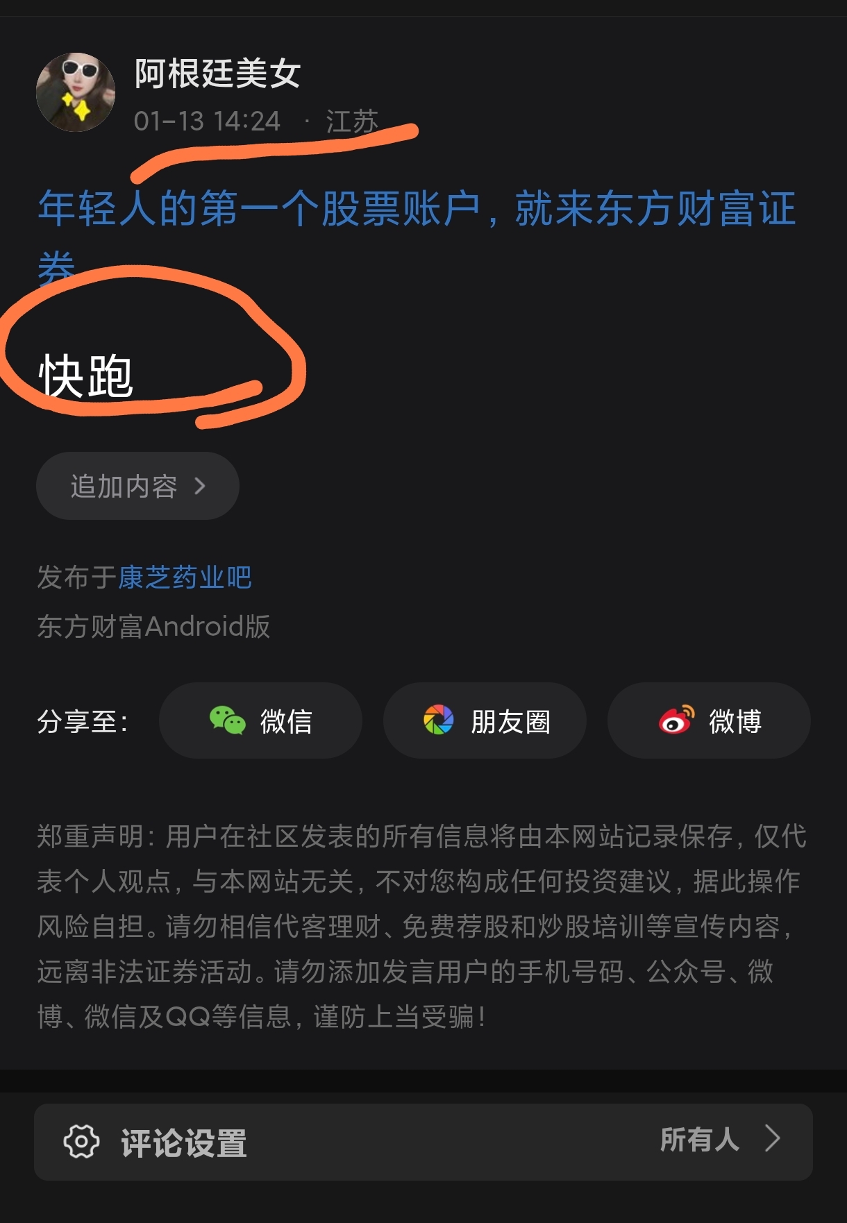 温馨提示: 1.根据《证券法》规定,禁止编造、传播虚假信息或者误导性信息,扰乱证券市场;2.用户在本社区发表的所有资料、言论等仅代表个人观点,与本网站立场无关,不对您构成任何投资建议。用户应基于自己的独立判断,自行决定证券投资并承担相应风险。《东方财富社区管理规定》