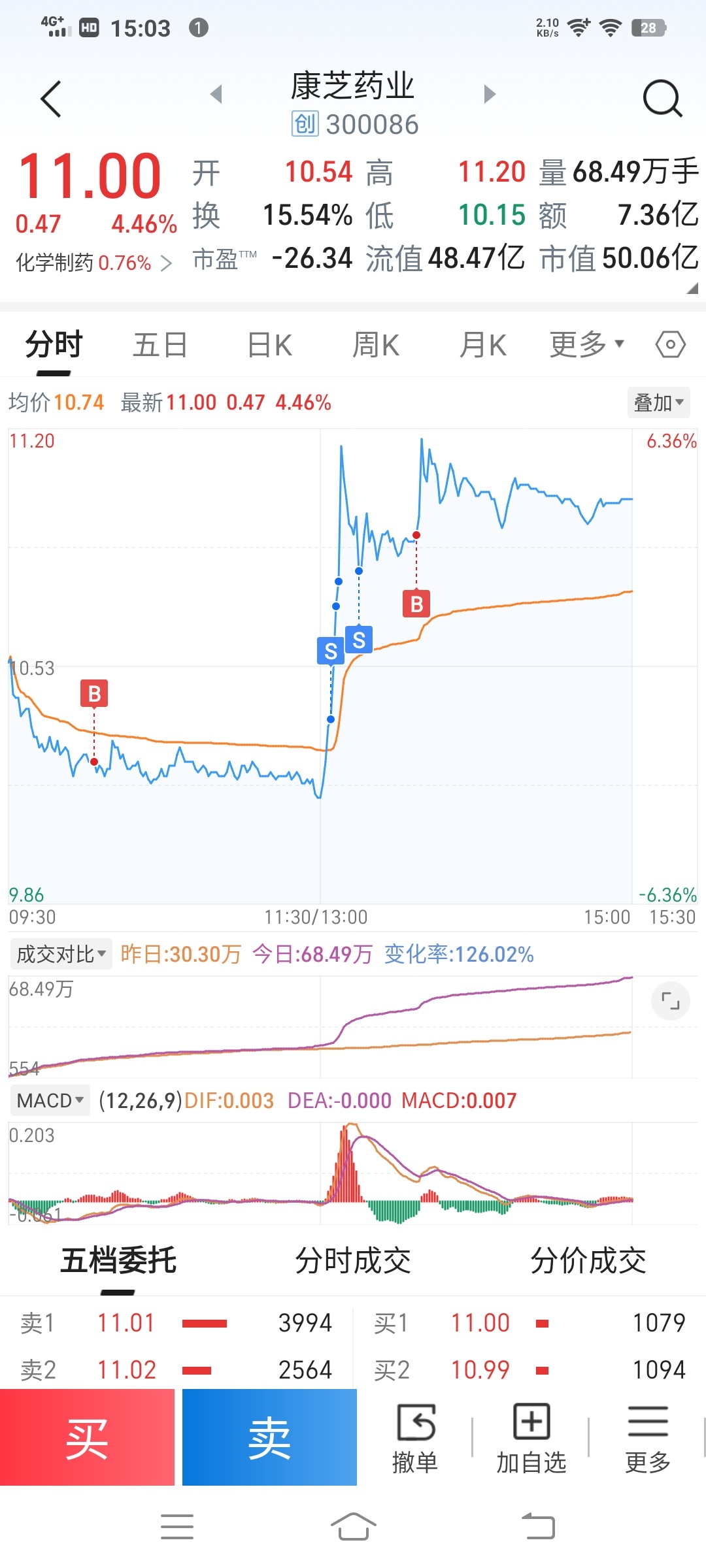 $康芝药业(SZ300086)$ 今天做题特失败,成本加了三毛,早盘本来挂11.09卖出的,,下午开盘撤单了,表示无语