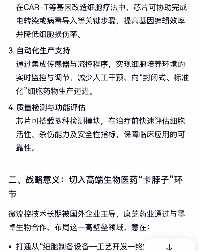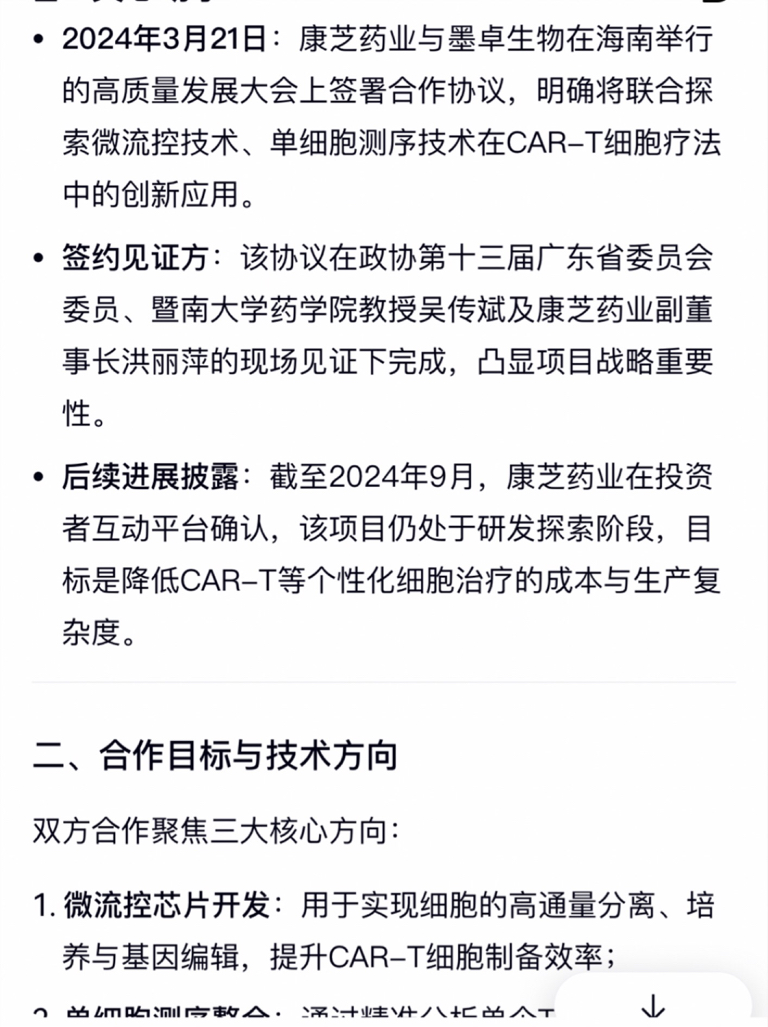 康芝药业与墨卓生物(MobiDrop)的细胞疗法专用微流控芯片项目合作于2024年3月21日正式签约并对外公布。该项目在“腾龙归海 逐梦自贸港 康芝大健康高质量发展大会”上签署的高端创新药物,标志双方在儿童多发血液肿瘤及自身免疫病治疗领域的前沿技术布局正式启动。战略意义:切入高端生物医药“卡脖子”境况。