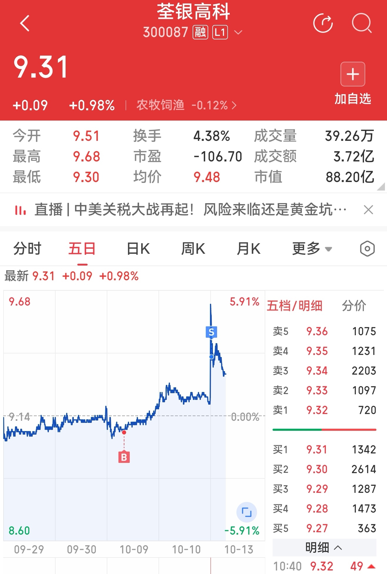 $荃银高科(SZ300087)$