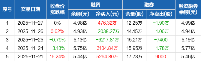 荃银高科:融资净买入476.32万元,融资余额4.98亿元(11-27)