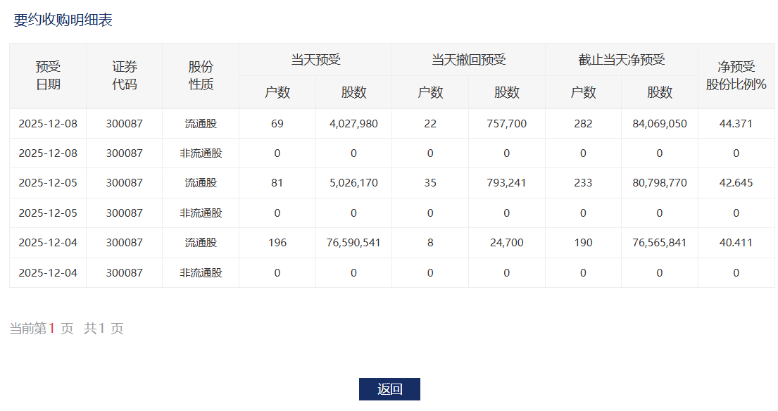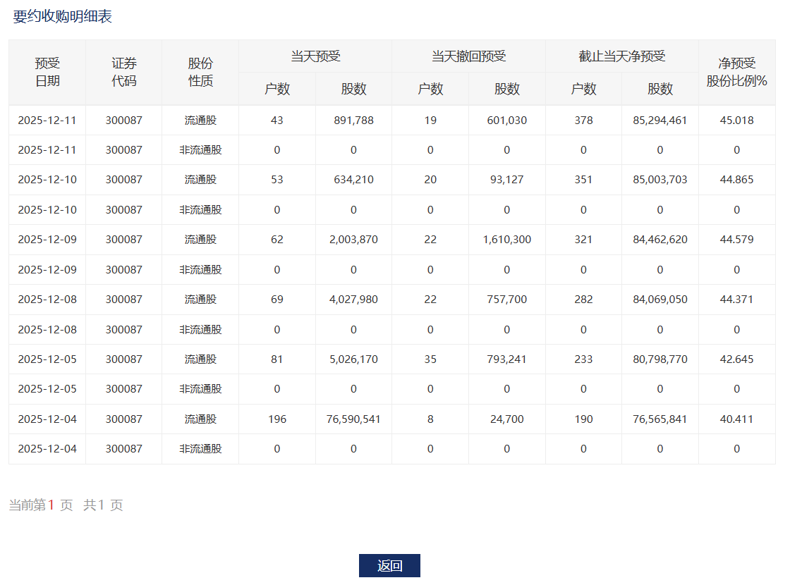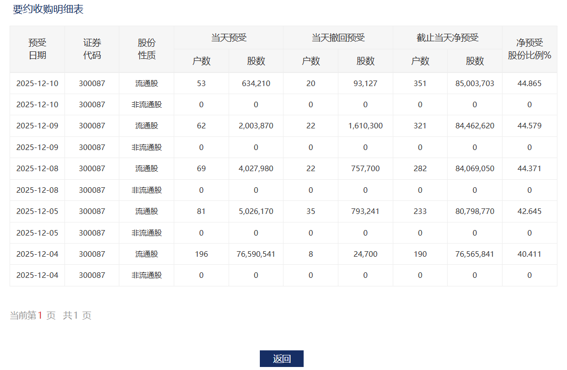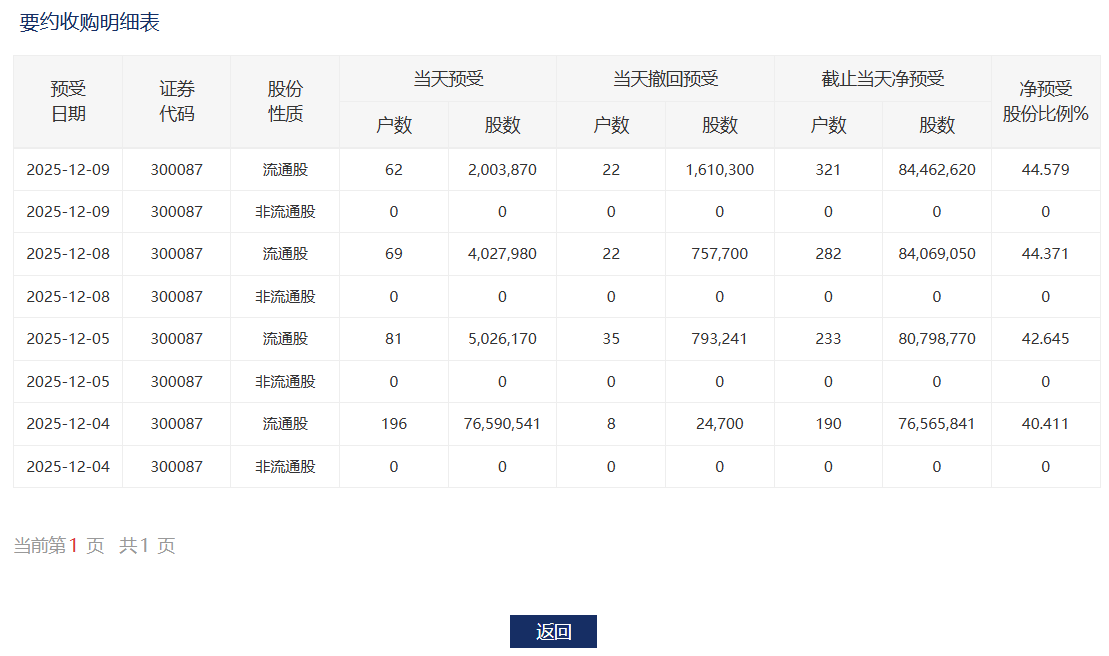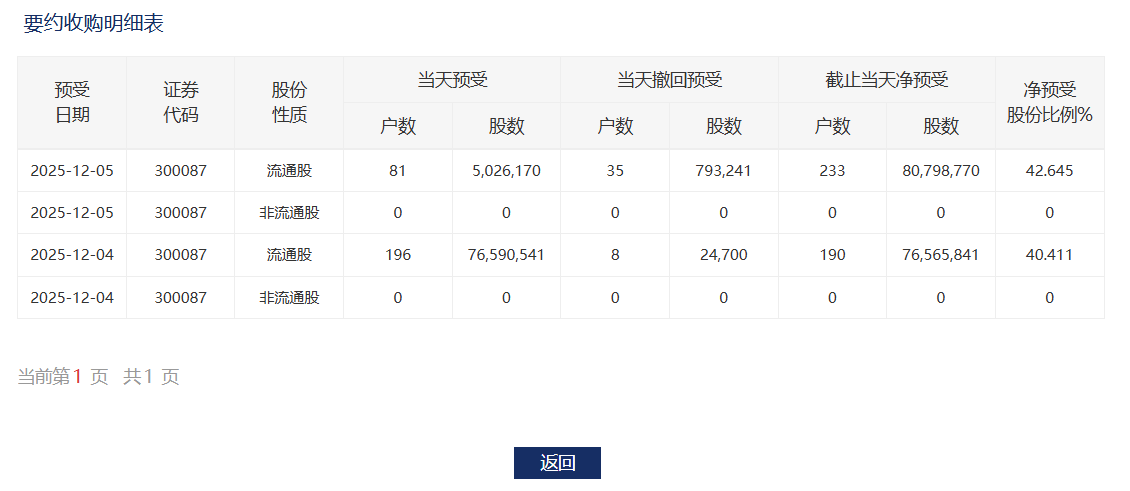 12月5日预受期次日,当天预受户数81户、股数502.62万股,撤回35户、79.32万股,净预受户数233户、8079.88万股,净预受股份比例为42.645%。
