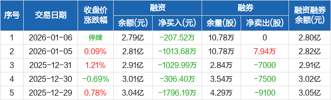 融资方面,当日融资买入0元,融资偿还207.52万元,融资净偿还207.52万元,连续8日净偿还累计9704.83万元。融券方面,融券卖出0股,融券偿还0股,融券余量10.78万股,融券余额126.02万元。融资融券余额合计2.8亿元。