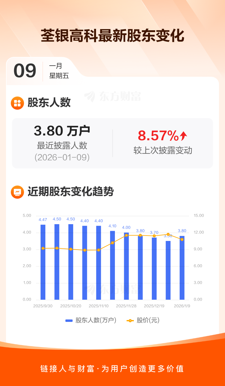 荃银高科最新披露数据显示,截至1月9日公司股东户数为3.80万户,较上期(2025年12月31日)增加3000户,增幅为8.57%。户均持有流通股数量由上期的2.56万股下降至2.36万股,户均持股金额由上期的29.89万元减少至25.36万元。