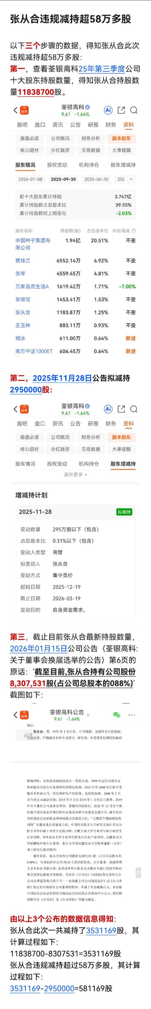 投诉成功三部曲,众人拾柴火焰举报标题写以下文字:荃银高科股票存在利益输送,公司副总经理张从合违规减持超过58万多股,证据确凿。第一步:打开中央纪委国家监委举报网http://www.12388.gov.cn/mx/第二步:复制以下文字以下三个步骤的数据,得知张从合此次违规减持超58万多股:第一,查看荃银高科25年第三季度公司十大股东持股数量,得知张从合持股数量11838700股。(截图附后)第二,2025年11月28日公告拟减持2950000股:(截图附后)第三,截止目前张从合最新持股数量,2026年01月15日公司公告〈荃银高科:关于董事会换届选举的公告〉第6页的原话:‘截至目前,张从合持有公司股份8,307,531股(占公司总股本的088%)’ (截图附后)由以上3个公布的数据信息得知:张从合此次一共减持了3531169股,其计算过程如下:11838700-8307531=3531169股张从合违规减持超过58万多股,其计算过程如下:3531169-2950000=581169股(截图附后)第三步上传此截图,后点提交。成功投诉,保留投诉码以便随时查询结果。