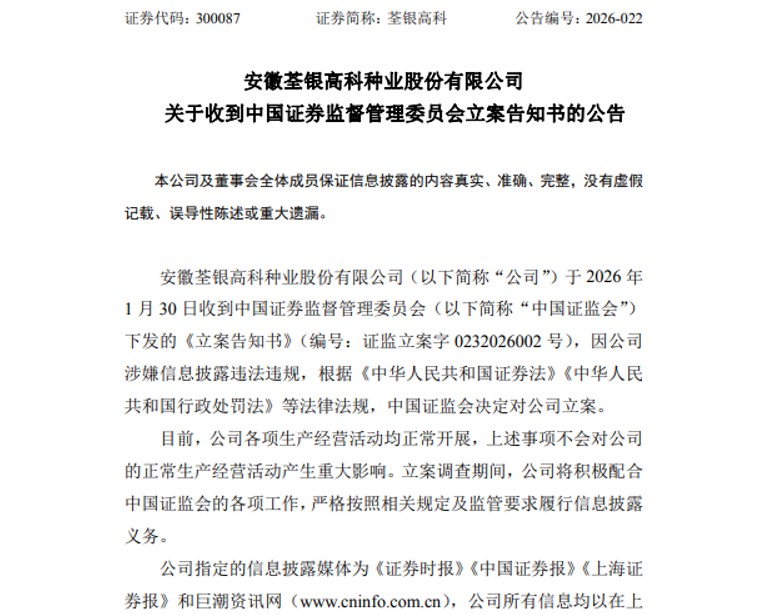 立案调查后,您是否在索赔范围内?维权时间节点至关重要!适格投资者条件:2026年1月30日之前买入300087荃银高科,且在2026年1月31日(含当日)之后卖出或继续持有者。以上索赔登记条件仅代表证威律所观点。不作为任何证券投资决策和买卖建议,最终以法院的认定结果为准。 了解更多点头像看企业信息 或 查看 证威律所 相关信息