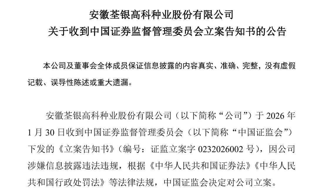 1月30日晚间,荃银高科(300087)公告称,公司于30日收到证监会下发的《立案告知书》,因公司涉嫌信息披露违法违规,根据《中华人民共和国证券法》《中华人民共和国行政处罚法》等法律法规,证监会决定对公司立案。