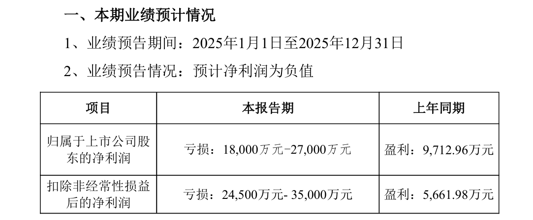 业绩方面,荃银高科1月30日晚披露的公告显示,该公司预计2025年归属于上市公司股东的净利润亏损1.8亿元至2.7亿元,上年同期为盈利9712.96万元;预计扣除非经常性损益后的净利润亏损2.45亿元至3.5亿元,上年同期为盈利5661.98万元。