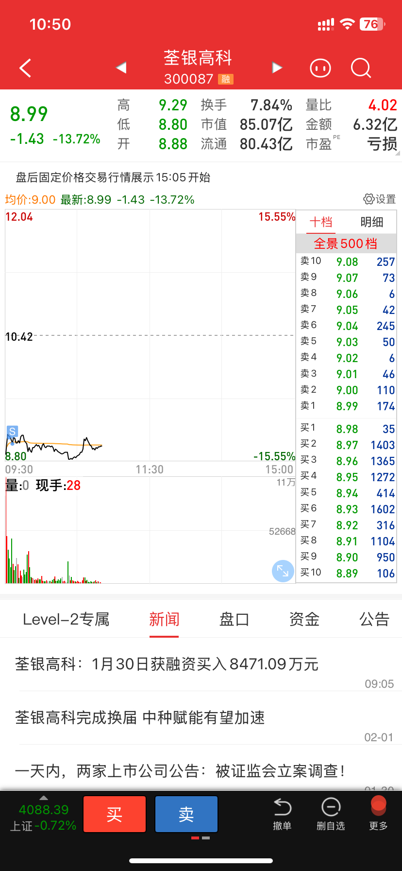 $荃银高科(SZ300087)$ 9.1割肉了,哎