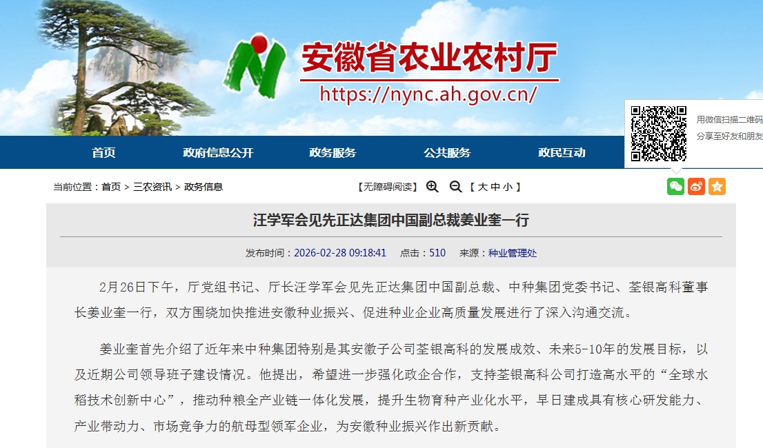 安徽农业厅网站2026年2月28日通告:推动种粮全产业链一体化发展,提升生物育种