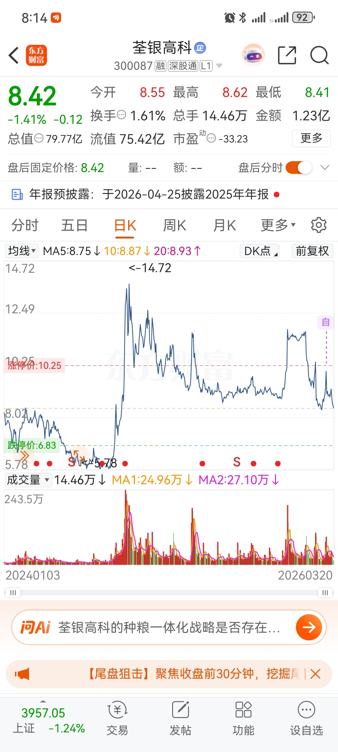 $荃银高科(SZ300087)$ 说实话,这种走势股票里面很罕见的,趋势就是一直再向下,我买了2万股,周一决定对割肉,没有一点希望可言 也祝各位买进的继续坚持自己的想法。