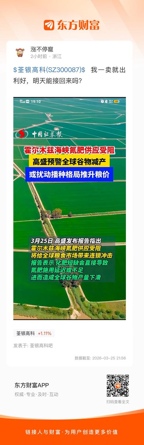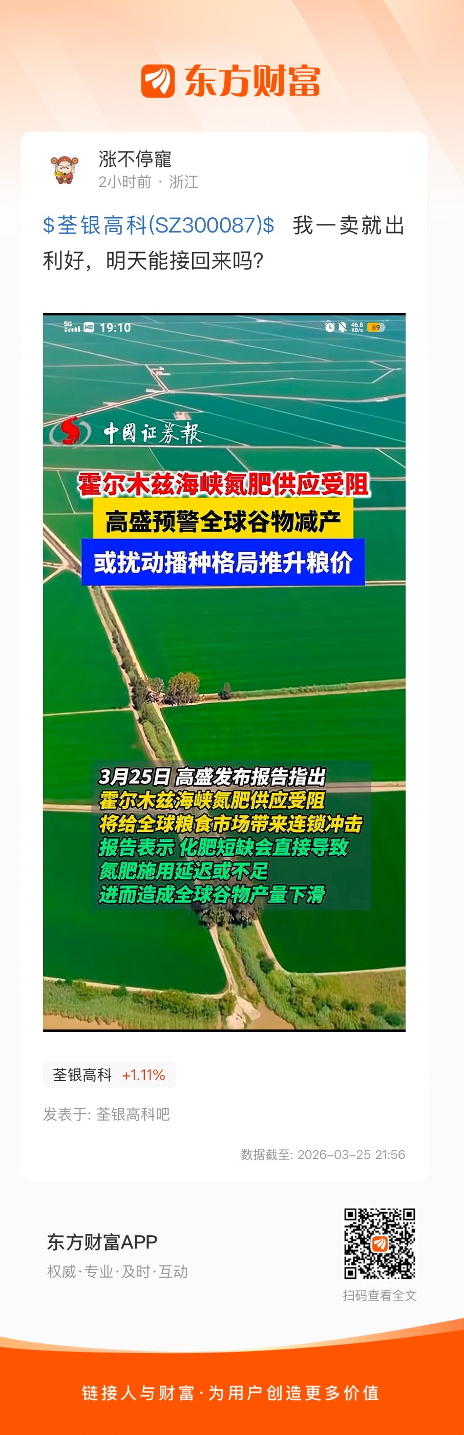 $荃银高科(SZ300087)$  我一卖就出利好,明天能接回来吗?