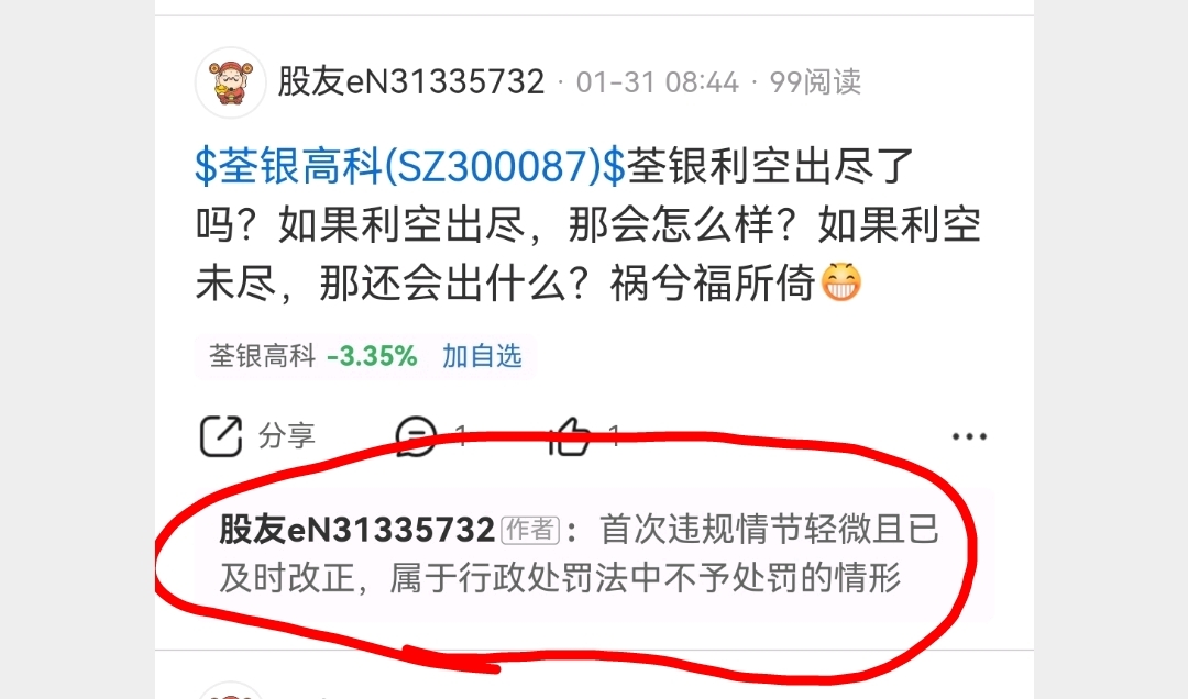 $荃银高科(SZ300087)$ 俺一个多月前预测不处罚