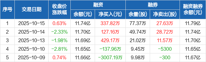 融资方面,当日融资买入5300.59万元,融资偿还4962.77万元,融资净买入337.82万元,连续3日净买入累计894.15万元。融券方面,融券卖出28.3万股,融券偿还6700股,融券余量77.37万股,融券余额490.53万元。融资融券余额合计11.79亿元。