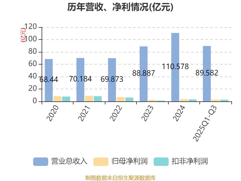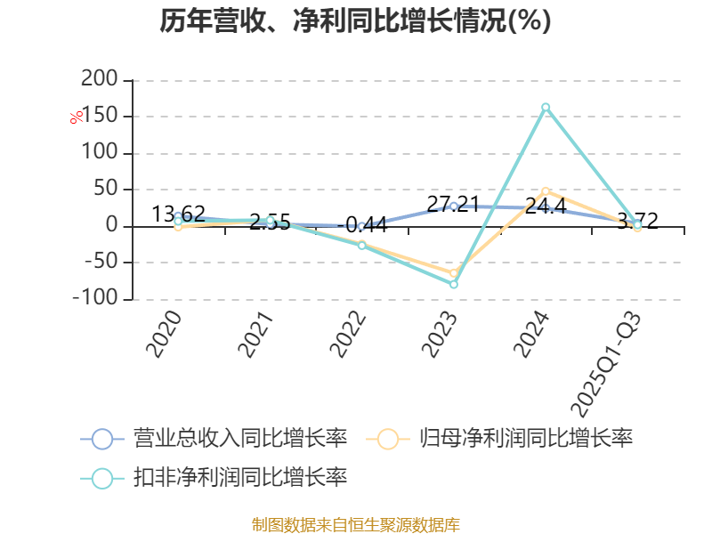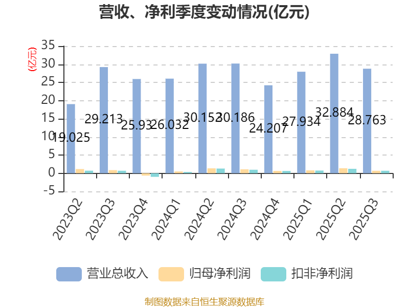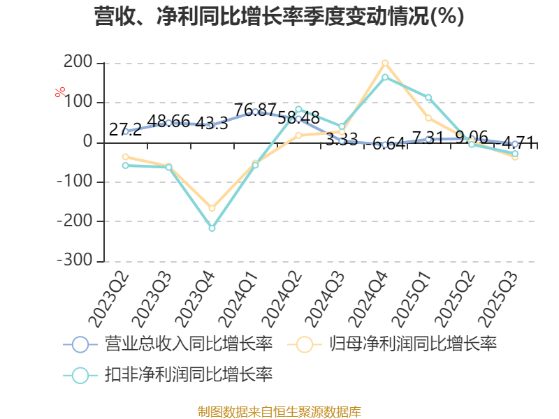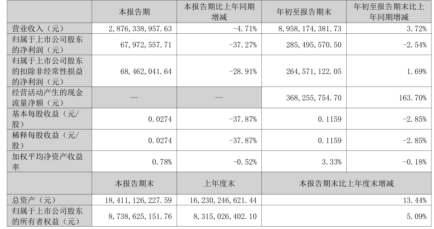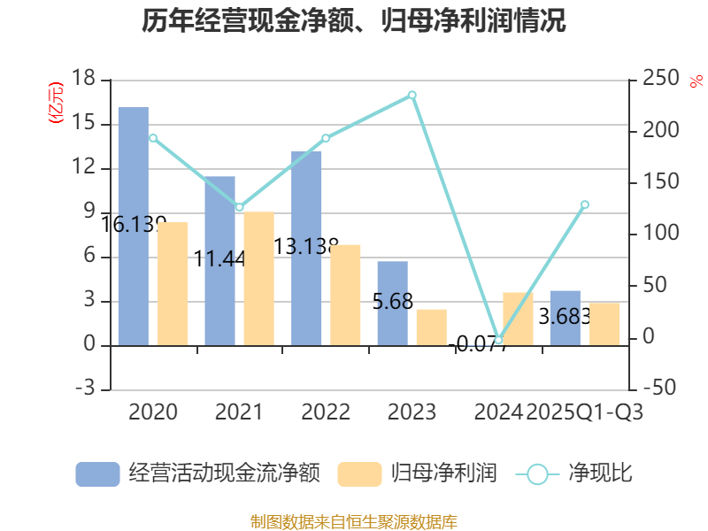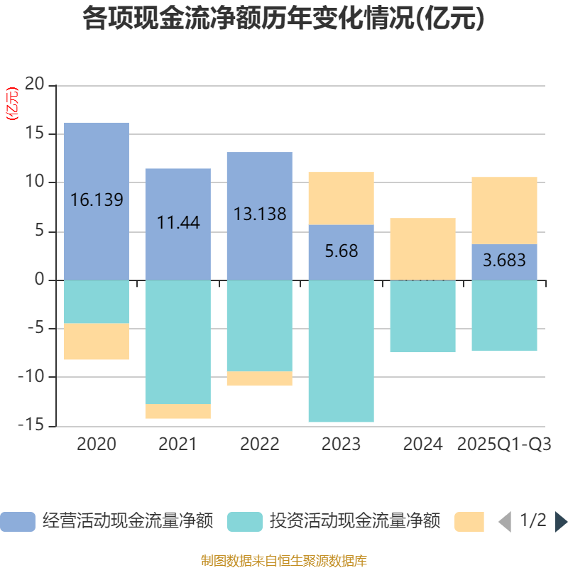 2025年前三季度,公司经营活动现金流净额为3.68亿元,同比增加9.46亿元;筹资活动现金流净额6.89亿元,同比减少4.51亿元;投资活动现金流净额-7.27亿元,上年同期为-8.03亿元。