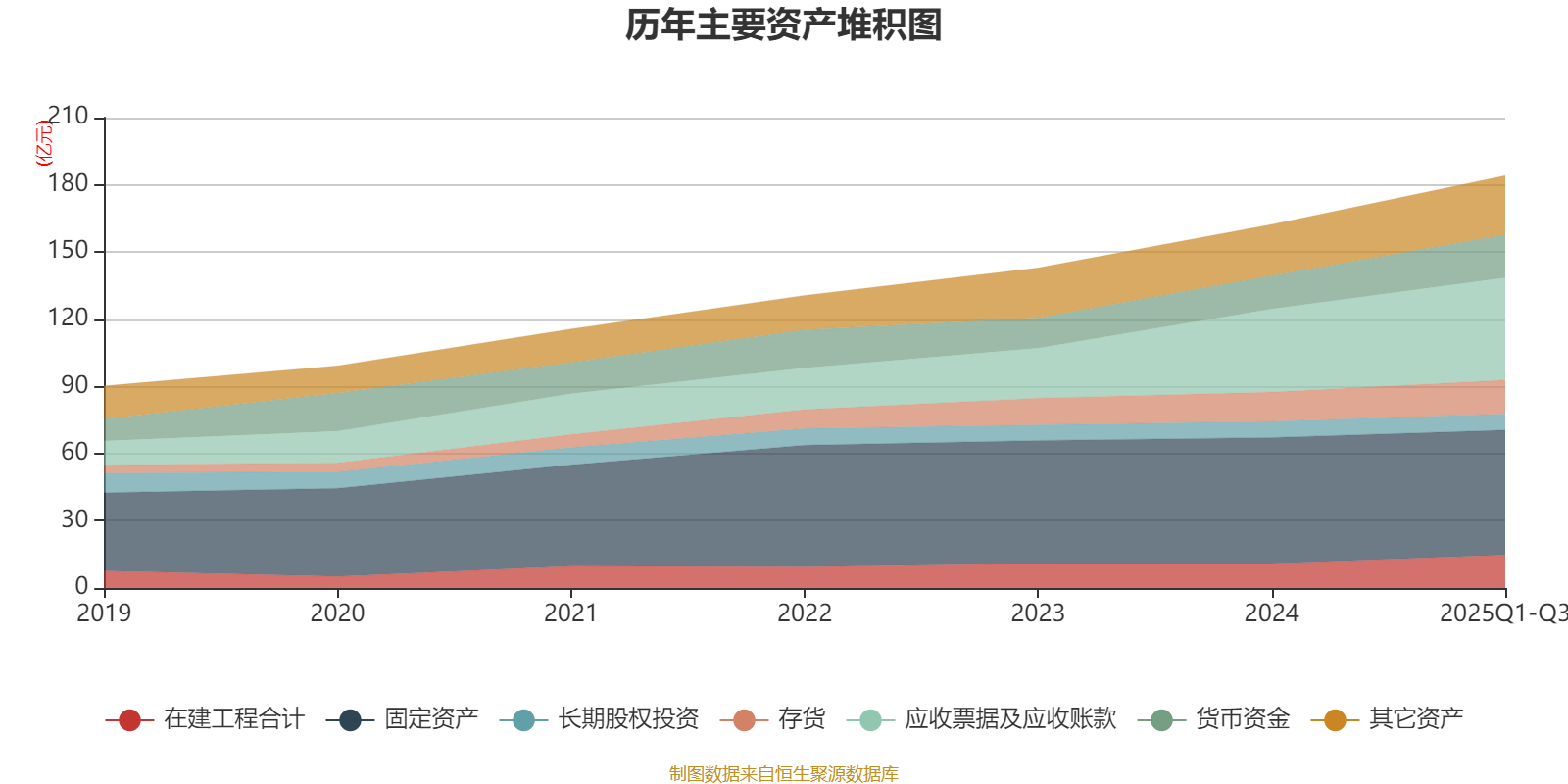 资产重大变化方面,截至2025年三季度末,公司固定资产较上年末减少1.01%,占公司总资产比重下降4.42个百分点;应收票据及应收账款较上年末增加23.18%,占公司总资产比重上升1.96个百分点;在建工程合计较上年末增加35.61%,占公司总资产比重上升1.31个百分点;货币资金较上年末增加28.99%,占公司总资产比重上升1.26个百分点。