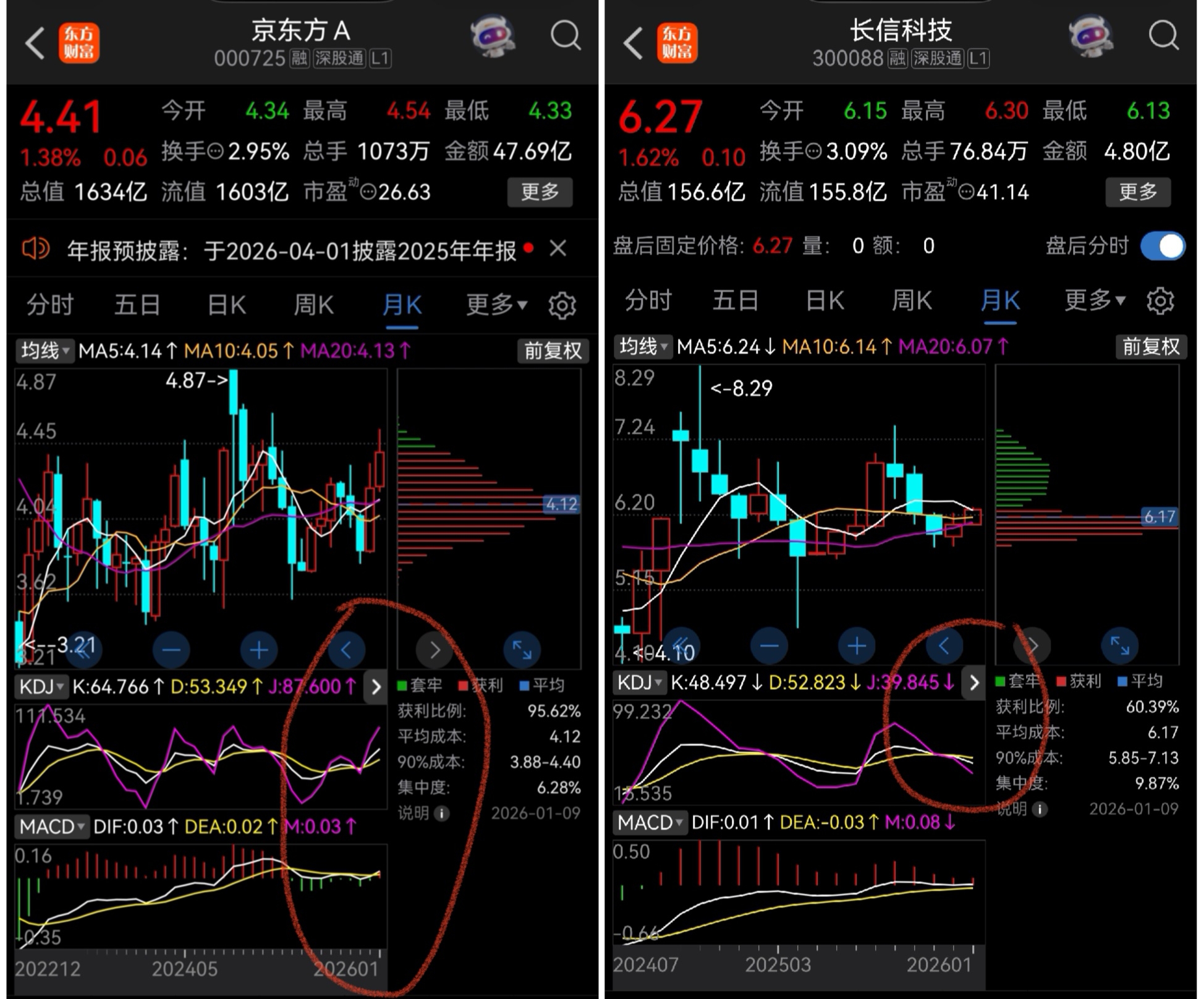 对比一下,京东方月线MACD,kdj金叉共振。而长信MACD金叉没形成,KDJ死叉。还死抱长信希望在哪里?