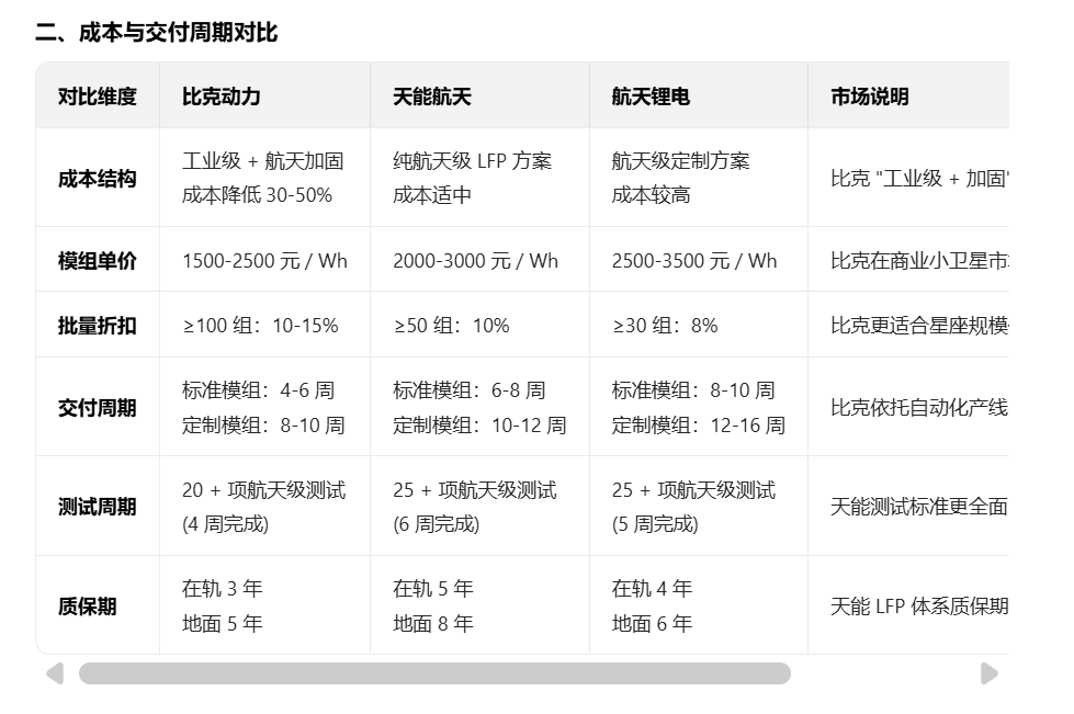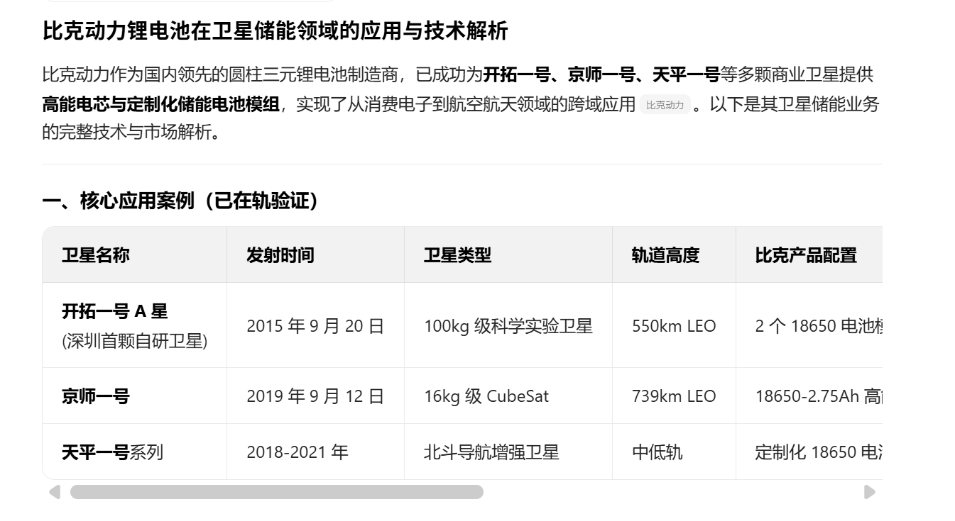 比克动力通过成熟的 18650 圆柱电池技术 + 航天级加固方案,成功切入商业小卫星储能市场,形成了 "成本优势 + 快速交付 + 可靠性能" 的差异化竞争力。随着商业航天规模化发展,比克有望在低轨星座储能领域占据更大市场份额,成为国内卫星储能电池的重要供应商之一。