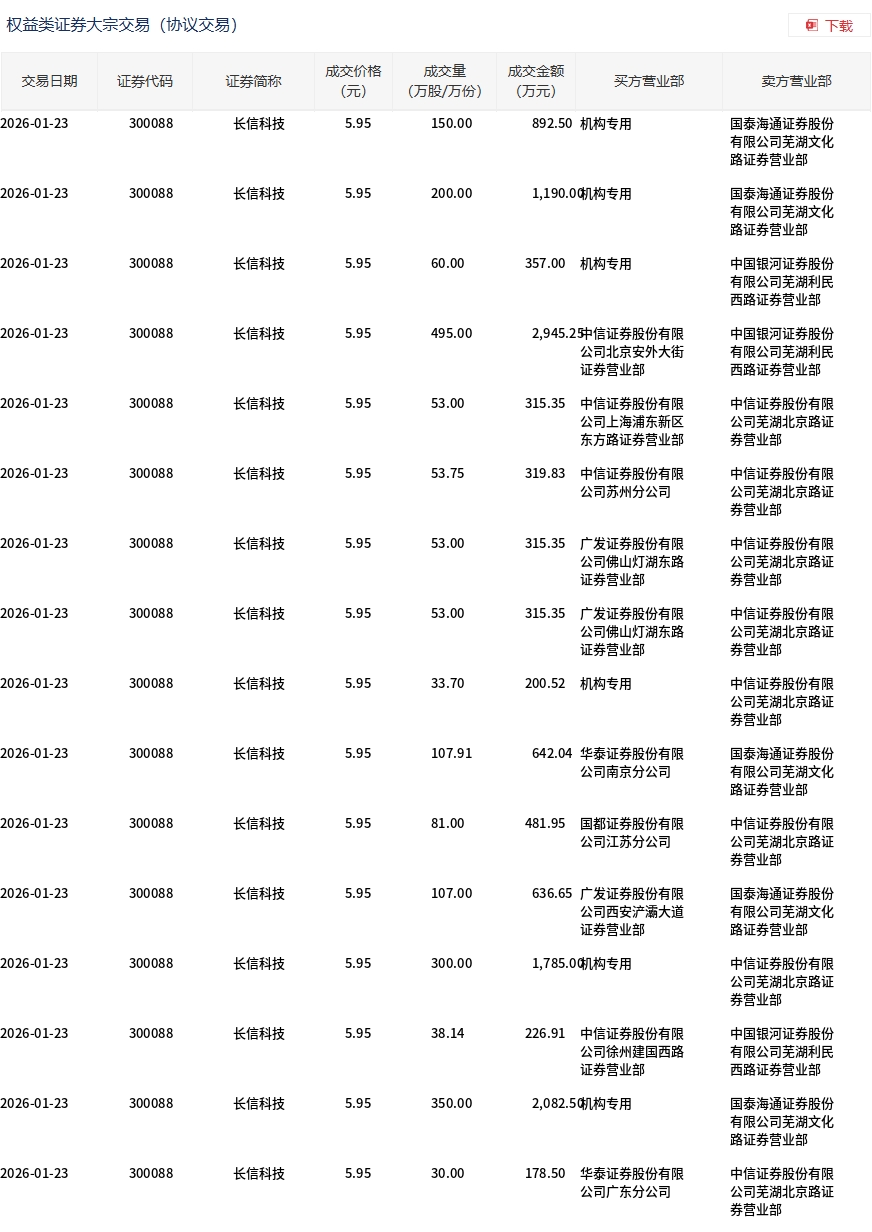 长信科技今日大宗交易折价成交2165.5万股,成交额1.29亿元