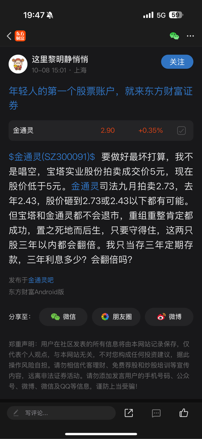 温馨提示: 1.根据《证券法》规定,禁止编造、传播虚假信息或者误导性信息,扰乱证券市场;2.用户在本社区发表的所有资料、言论等仅代表个人观点,与本网站立场无关,不对您构成任何投资建议。用户应基于自己的独立判断,自行决定证券投资并承担相应风险。《东方财富社区管理规定》