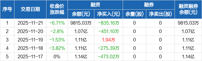 金通灵:融资净偿还835.16万元,融资余额9815.03万元(11-21)