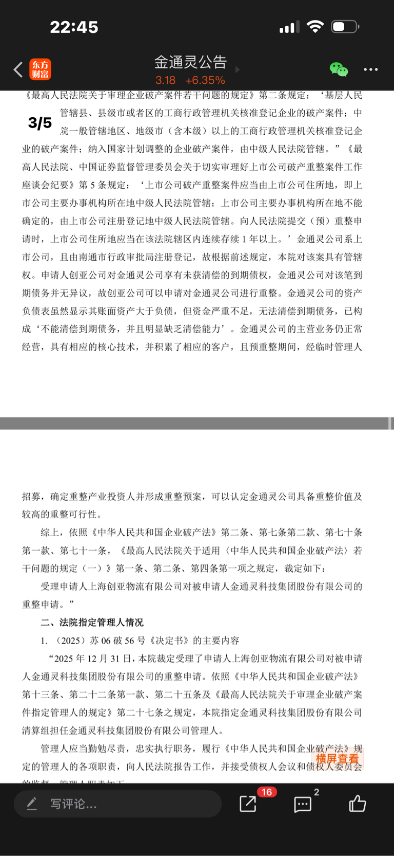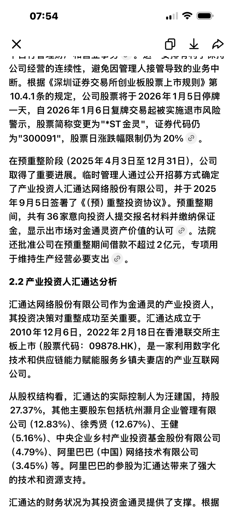 $金通灵(SZ300091)$ 这些人都不去了解为什么带星带帽。国企不可以自行商量重整,必须法院受理裁决。从4月份就开始预重整。然后九月份汇通达从36家意向投资者胜出。出资9.94亿占股25%,然后12.31日法院通过重整裁决。再加上金通灵是国企,拥有核心竞争力,核心技术,稳定客户,核心债权人没必要鱼死网破,我个人认为偏向利好,但是开盘肯定会吓一波恐慌盘