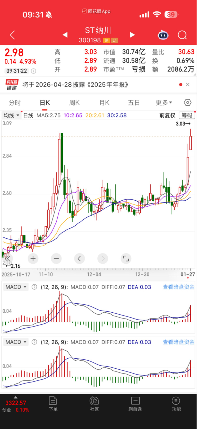 牛市的两支垫底股,纳川财投1.24元,暂还没拿到路条,10月份股价2.1元,现在