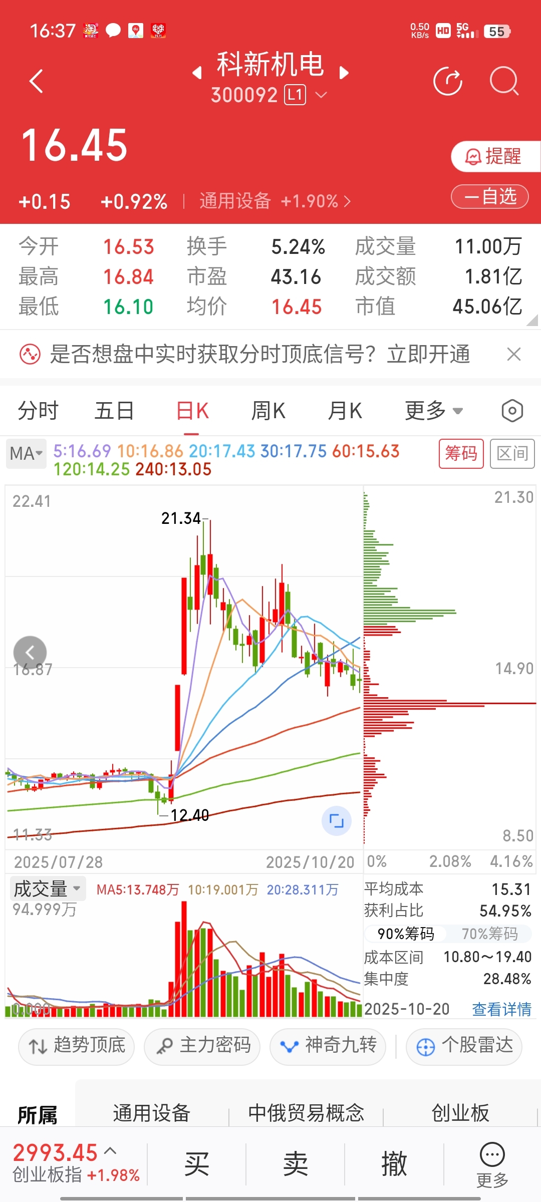 $科新机电(SZ300092)$ 大宗交易13.21而科新最高价21.34*0.618=13.18回调13元附近可大胆买入
