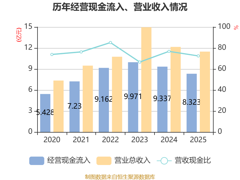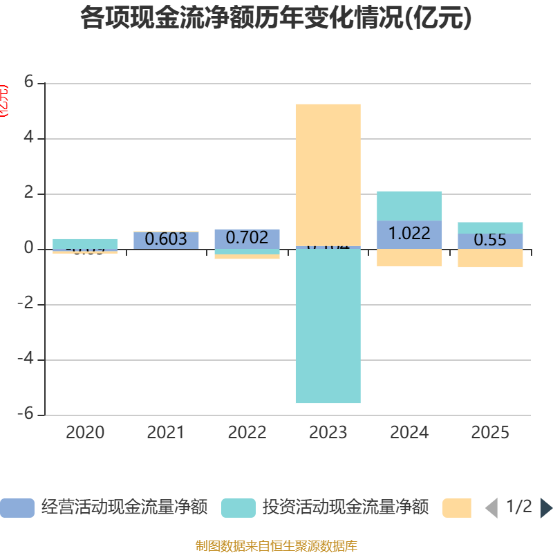 截至2025年,公司经营活动现金流净额为5496.52万元,同比下降46.2%;筹资活动现金流净额-6519.37万元,同比减少219.14万元;投资活动现金流净额4106.83万元,上年同期为1.05亿元。