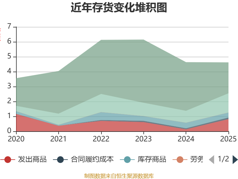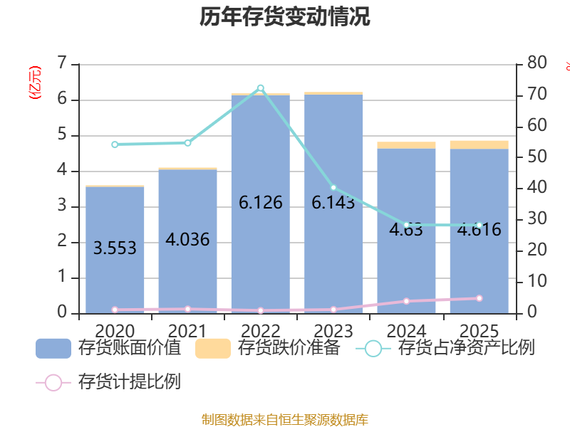 从存货变动来看,截至2025年末,公司存货账面价值为4.62亿元,占净资产的28.27%,较上年末减少136.81万元。其中,存货跌价准备为2311.18万元,计提比例为4.77%。