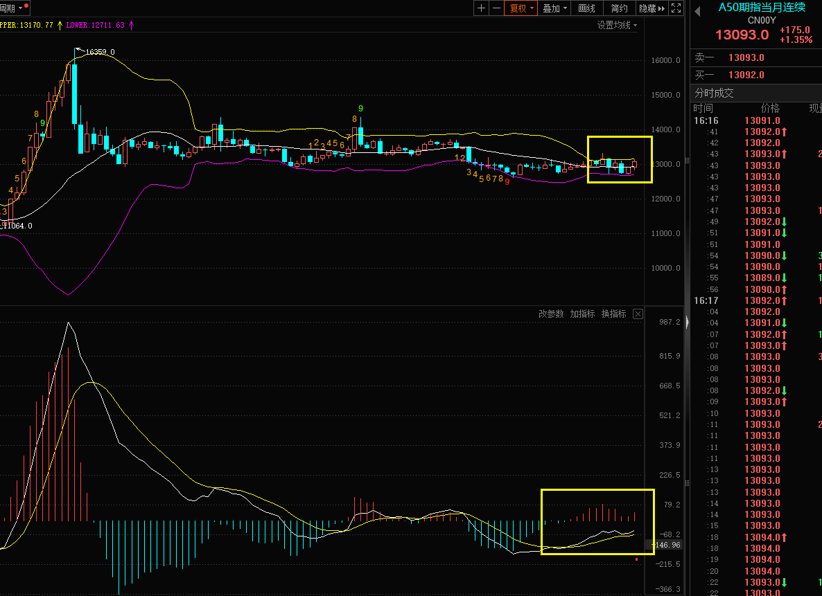我们再通过富时上证50期指的走势看盘,2月5号6号日k线上证50期指回踩布林线的下轨。现在又摸到了布林线的上轨位置。这个地方还有震荡,会回踩一下布林线中轨,把布林线的三根轨道线扩张开来。现在三根轨道线是走平的微微上翘扩张的走势。是一个变盘的位置。这个地方震荡几天,布林线的三根轨道就会扩大。现在上证50期指macd日线是老鸭头的走势。相信大家看到前面的文章,已经多次提示到上证指数也就回调不了多少。上证50期指是代表着上证50相关的个股。通过第上证50期指的分析和上周指数的分析,这个位置大家是谨慎做多。不要太乐观。