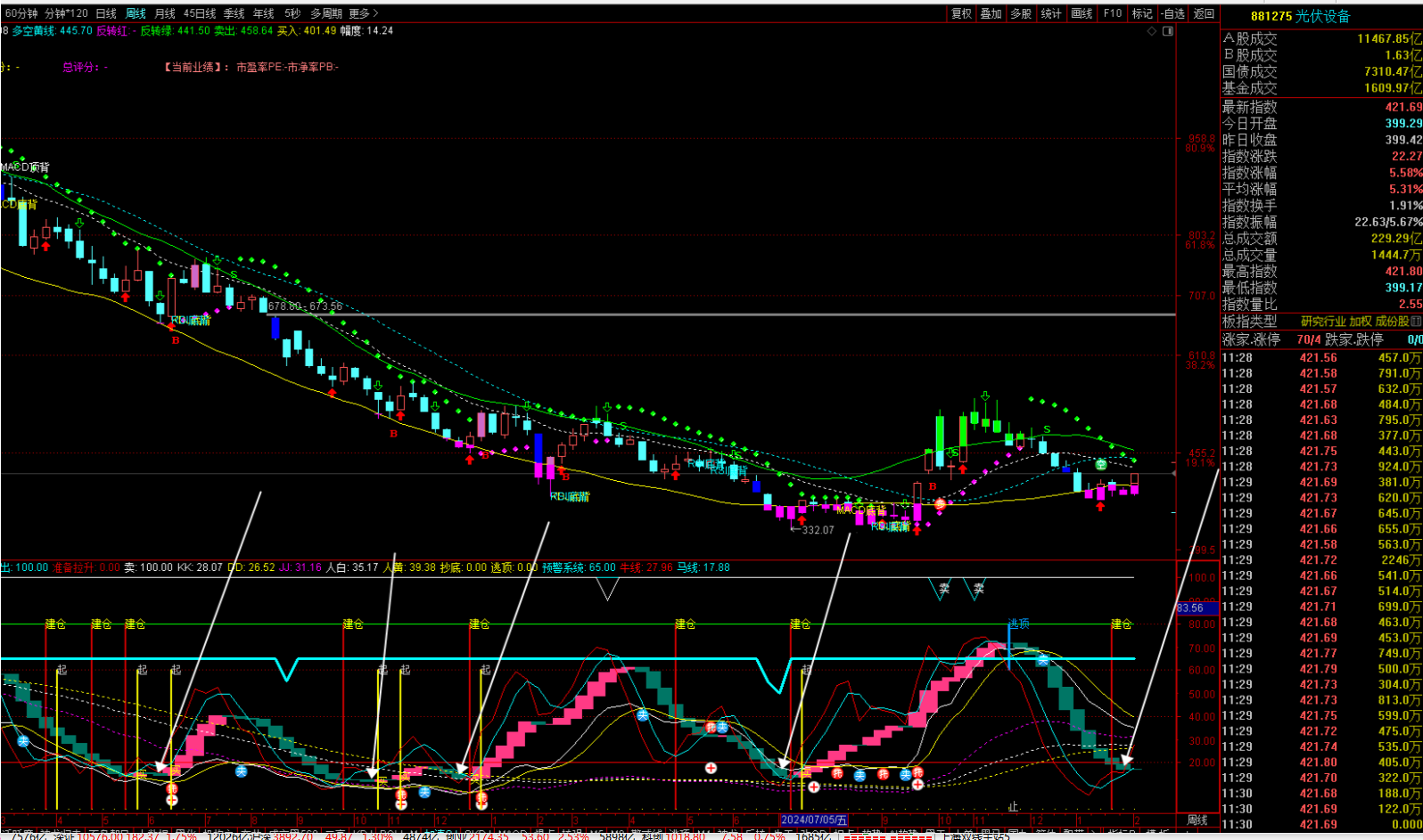 光伏设备板块,如果下个星期一星期二盘中有回调,依然是买点位置,光伏设备到了周线的反转点位置,随时都有可能有大阳线上涨。光伏设备的上涨会带动风能和储能以及锂电池。中午讲课的过程当中也讲了到了趋势反转点。