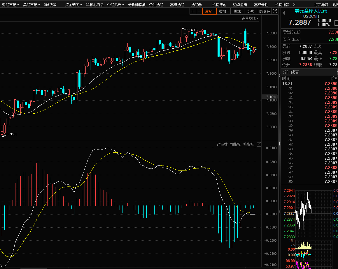 我们再来看与上证指数走势相关的指数。那就是美元指数和30年国债指数,还有就是美元离岸人民币指数。这几个指数只要回调,我们的上证指数就会上涨,它们的走势和上证指数走势是相反的。现在美元指数和30年国债指数元、美离岸人民币指数日线macd都是多次顶背离,已经说了多次通过日k线看盘随时都有可能出现向下大幅度回调。他们如果在日k线里面一旦见了中期的高点,我们的A股就会迎来真正的3浪过左肩3674点的主升浪。