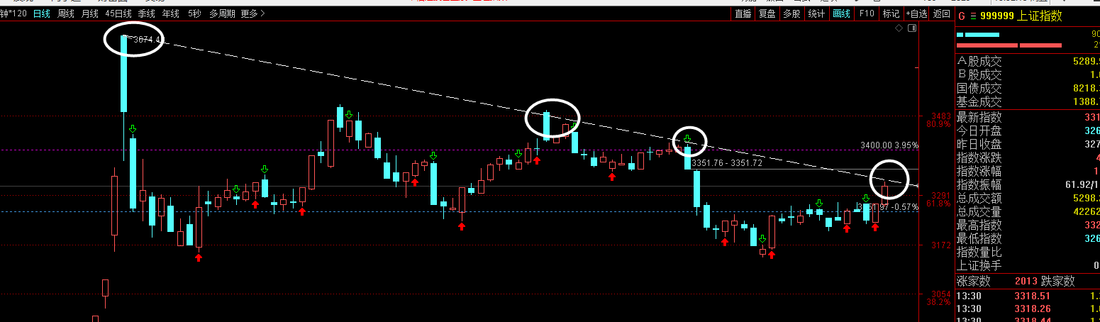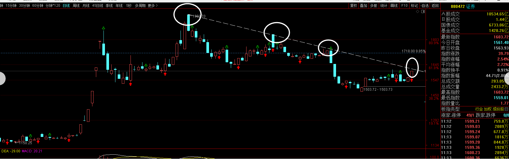 我们再去看看上证指数3325点为什么讲这个地方会有震荡?上证指数现在还是一个下降趋势的压力线位置。包括券商指数也是一样的。下降趋势线的反压位置就是3325点。上午11:13.直播当中也讲了券商的压力位是在1640点左右。当时还发了反压线。再看看下午1:30直播当中有没有截图。图片上面有时间,都是画了趋势线的。
