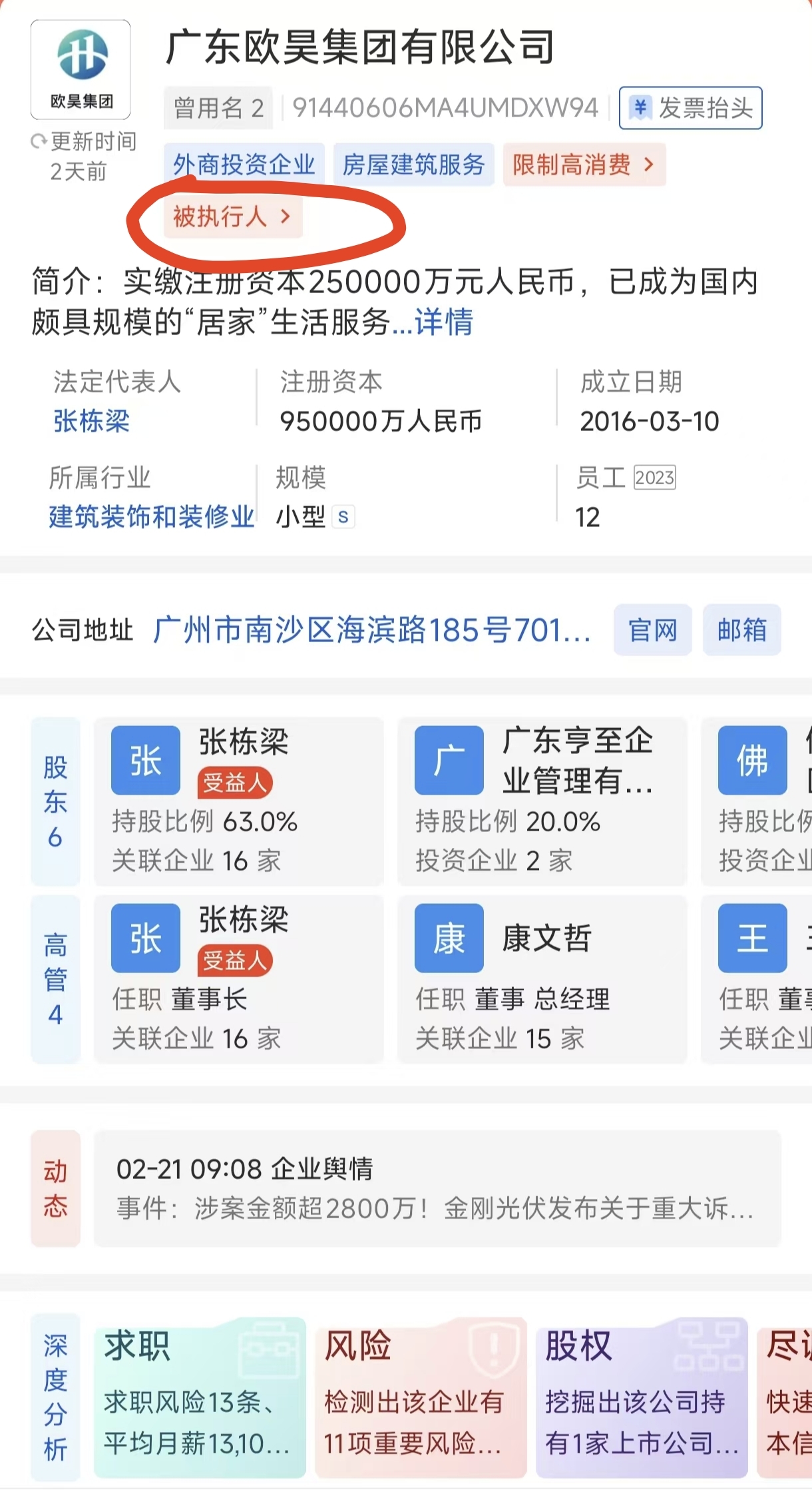 大股东欧昊集团已成为被执行人,当前被执行金额7亿左右,历史被执行金额40亿左右,