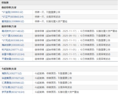 上证报中国证券网讯 11月19日,3家公司临停:*ST金刚、*ST正平、爱克股份,5家公司复牌:海联讯、华蓝集团、汇源通信、*ST东易、梦天家居。
