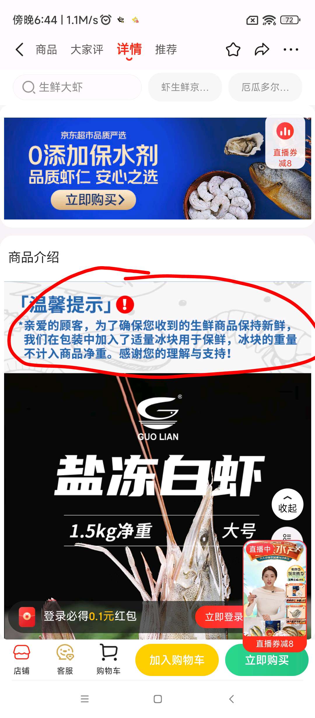 315反应的虾仁冰冻加冰计入净重,国联直接去除冰块重量,就是虾仁净重,值得大家购