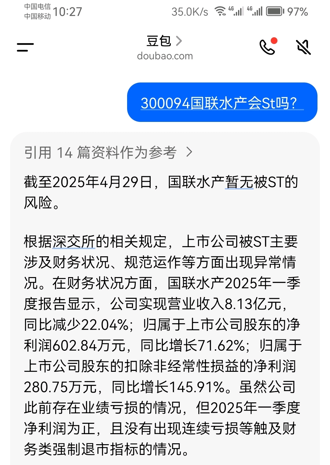 $国联水产(SZ300094)$ 对于吧内“目标80上实”发表的关于国联水产4月29日停牌、会被St一文,强烈要求国联水产公司给予答复,如果是造谣,希望报告证监部门给予严惩,如果情况属实,希望告知广大股东!(为了安全起见,我在人工智能搜索到的结果如下图。