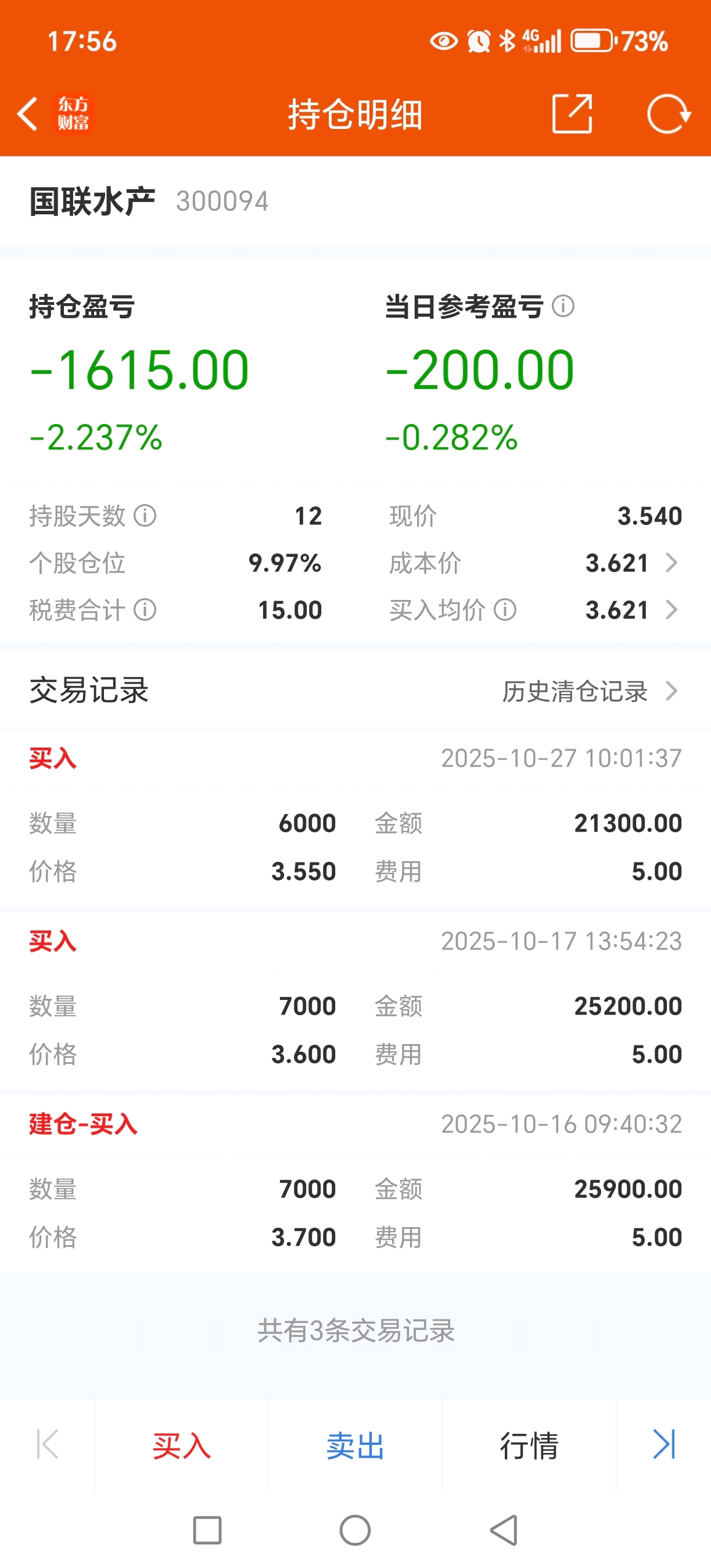 $国联水产(SZ300094)$ 明天开盘就要亏一万四吧