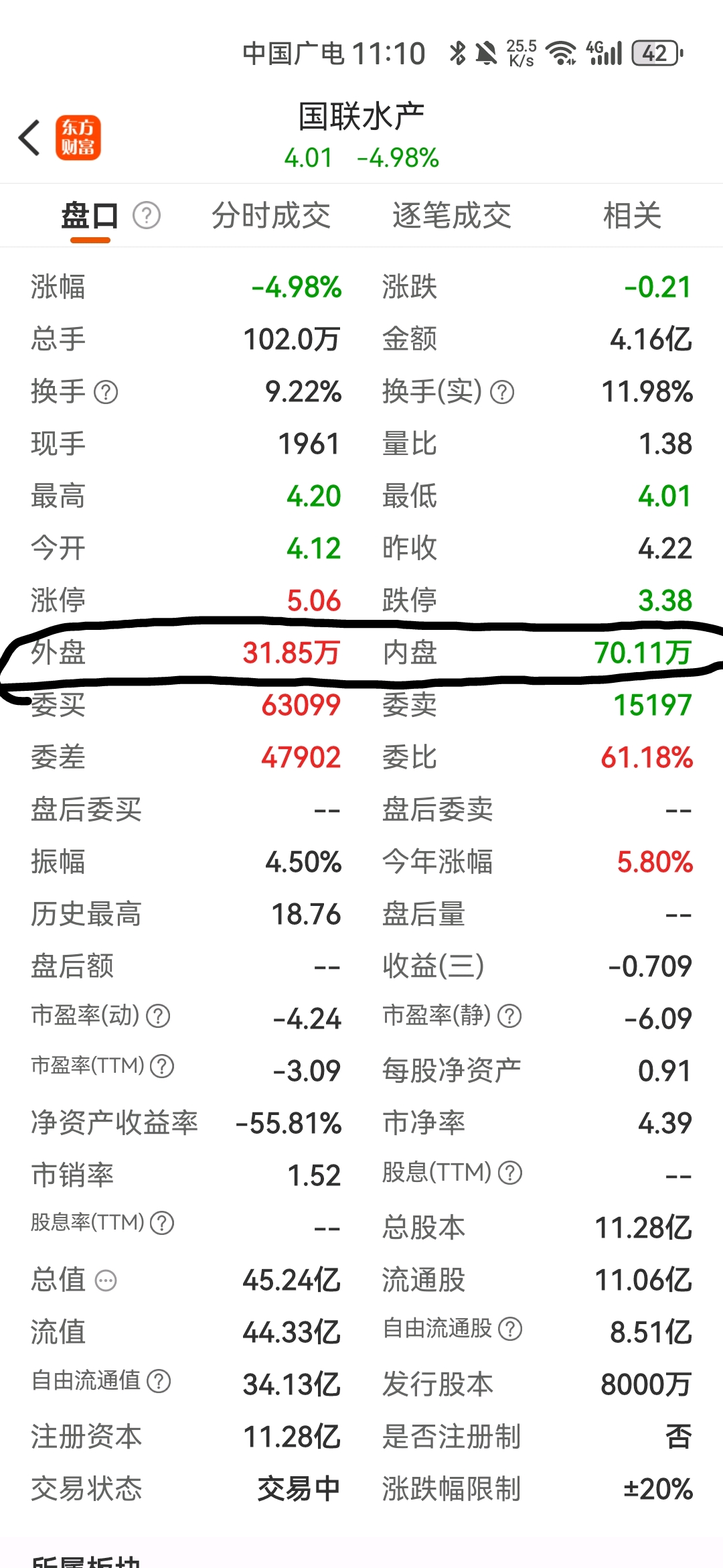 $国联水产(SZ300094)$ 这样的内外盘比,甩拉几都不见得有这么急不可耐吧