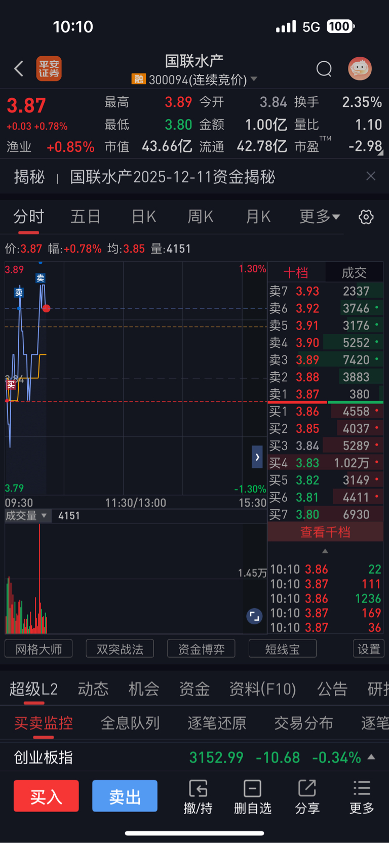 $国联水产(SZ300094)$ 主力,你们自己看着办,3.83的单子你刚才差一点就给我成交了,排在很前面,有没有看到31和77,买到这点货的话,均价大概在3.845,无所谓,我和你们耗时间也没关系。你亏得起,太了解你们了。