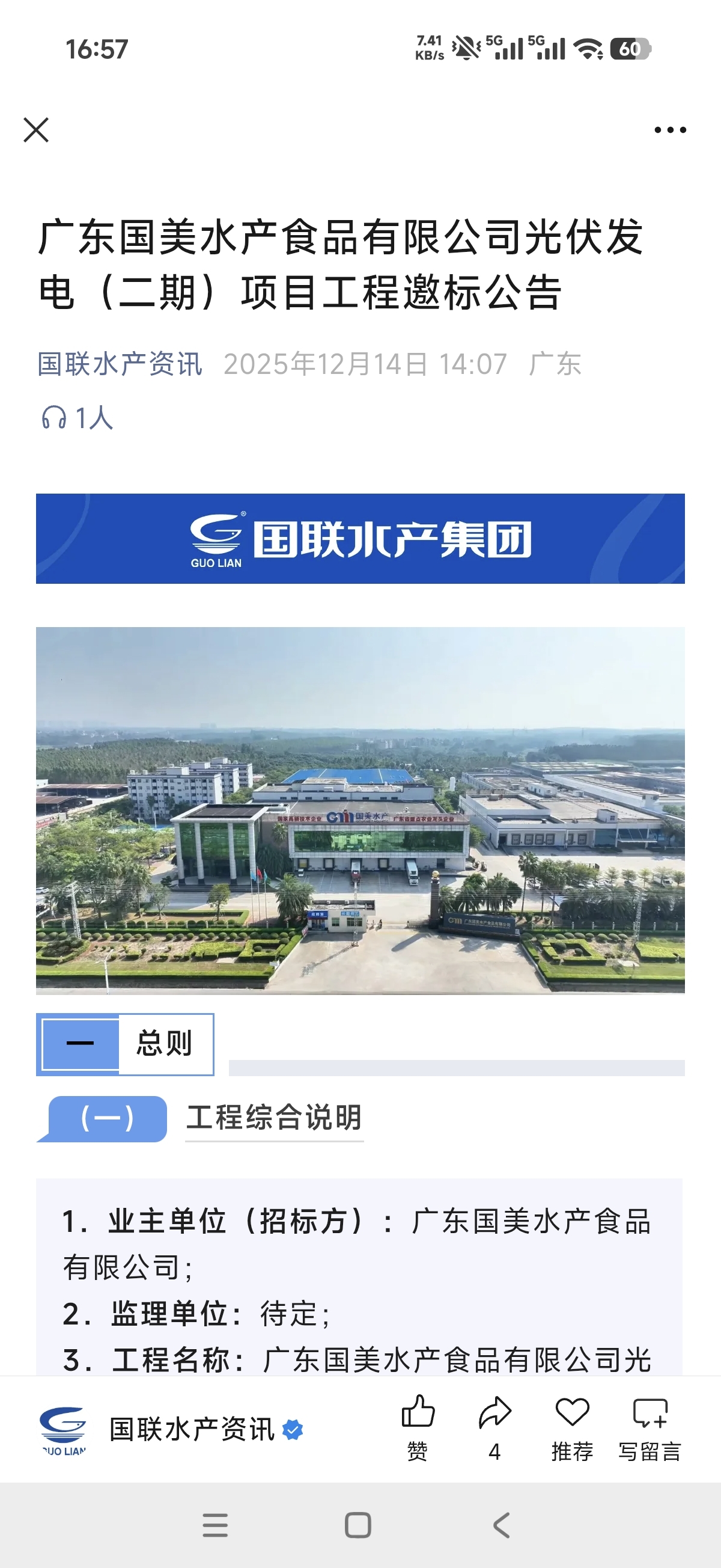 $国联水产(SZ300094)$ 国联水产有光伏发电,现在都二期招标了