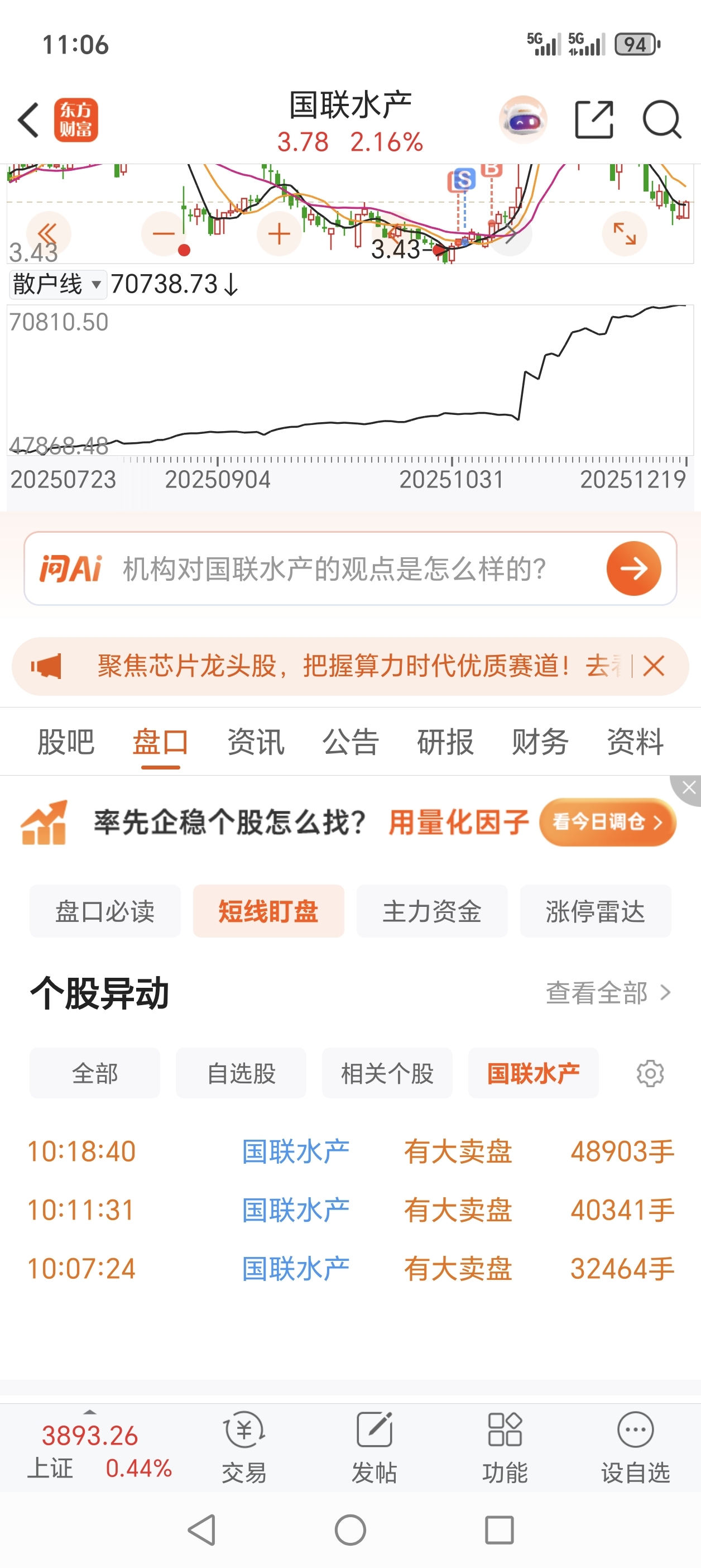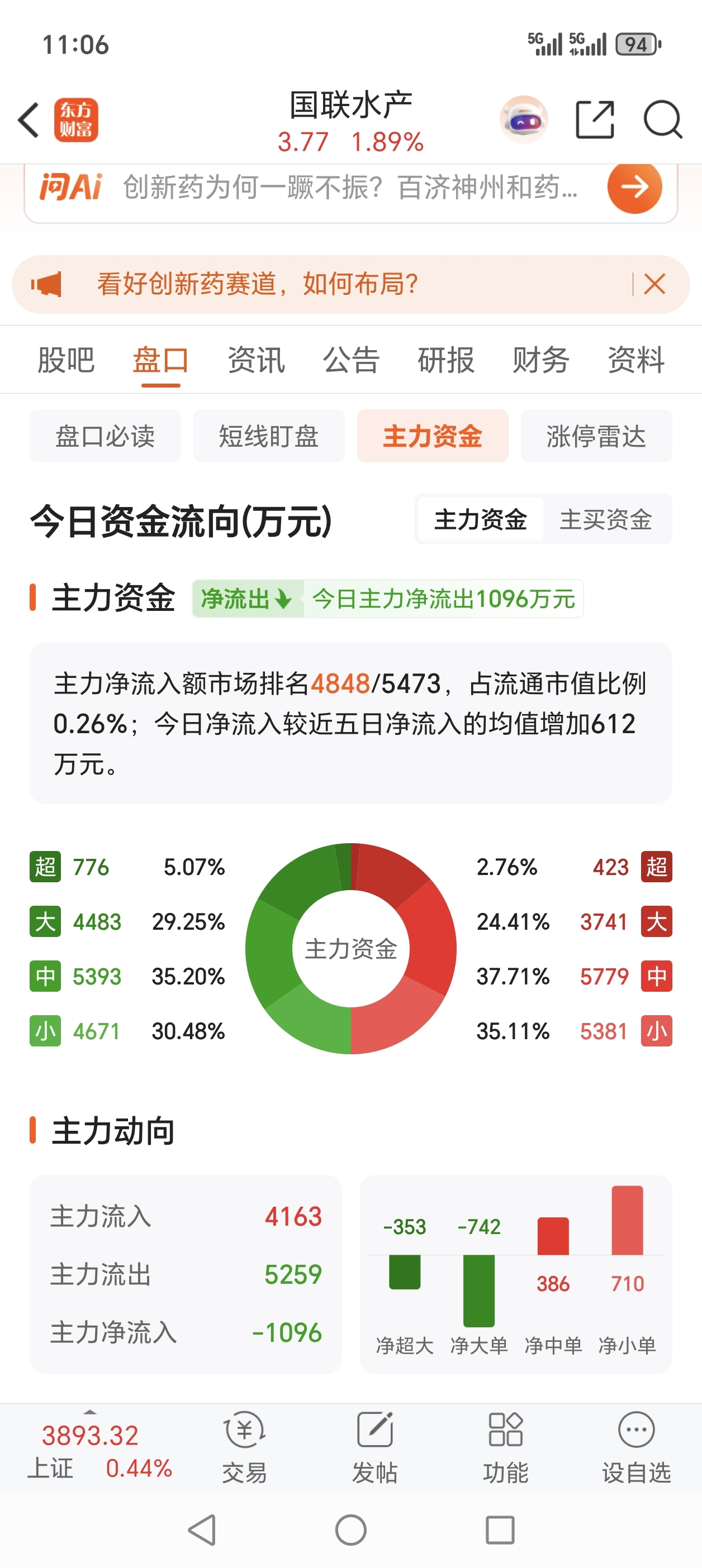 $国联水产(SZ300094)$ 主力还在跑,散户集中营,还敢买?别被误导了。还有的跌呢?