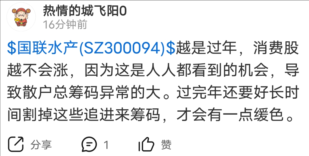 $国联水产(SZ300094)$ 热情的城飞阳0,你说不过就拉黑,真是托一个,