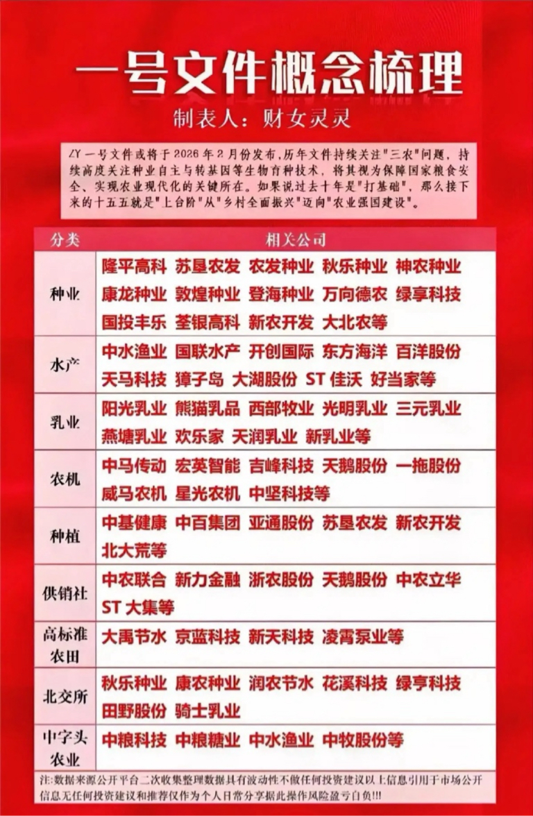 2026年一号文件将推动农业强国建设,种业、农机、高标准农田等核心赛道迎来明确政策催化,龙头标的兼具短期情绪驱动与中长期产业趋势支撑。建议优先选择技术壁垒高、订单确定性强、绑定政策资源的核心标的,规避纯题材炒作,把握农业升级带来的结构性机会。