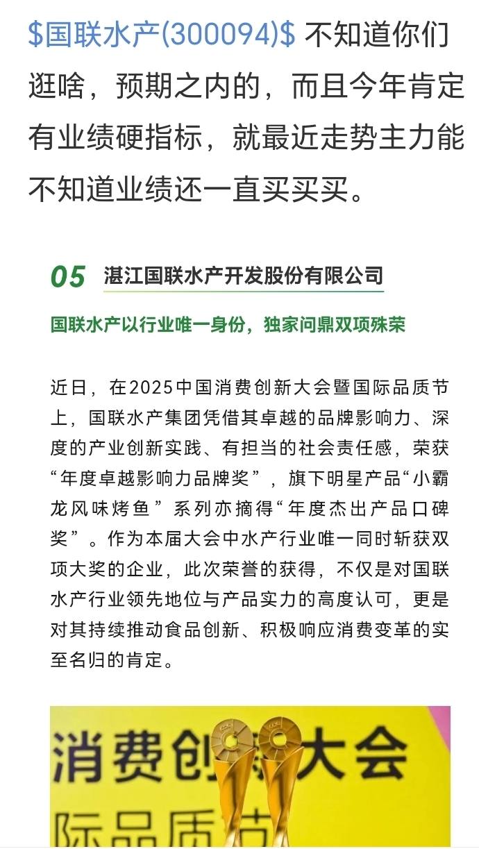 $国联水产(SZ300094)$ 联获二项大奖,商誉价值也有二十亿